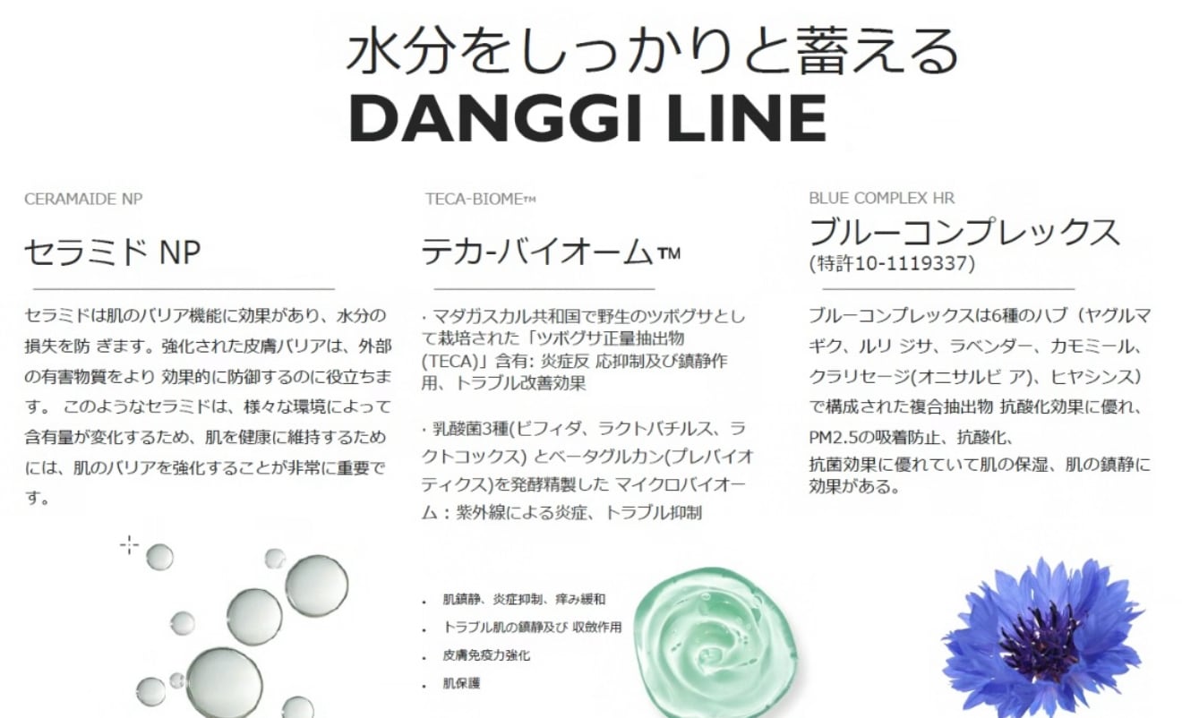 THE iLLONのDANGGIシリーズでは、肌の基礎体力を強化し、洗顔後の水分損失を防ぐために、真当帰抽出物を配合。特にDANGGI CLEANSING MILKでは、肌のバリアを守りながら、汚れだけを優しく落とす処方となっています。