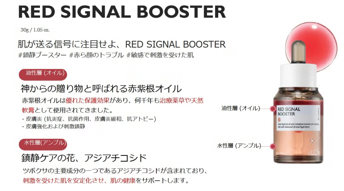 「RED SIGNAL BOOSTER」は、敏感肌のためのスペシャルケアアイテム。韓国コスメの技術と伝統的な自然由来成分を融合し、トラブル肌をやさしく包み込みながら、本来の健やかさを取り戻します。毎日のスキンケアに取り入れることで、赤みや刺激に負けない、しなやかで落ち着いた肌へと導きます。