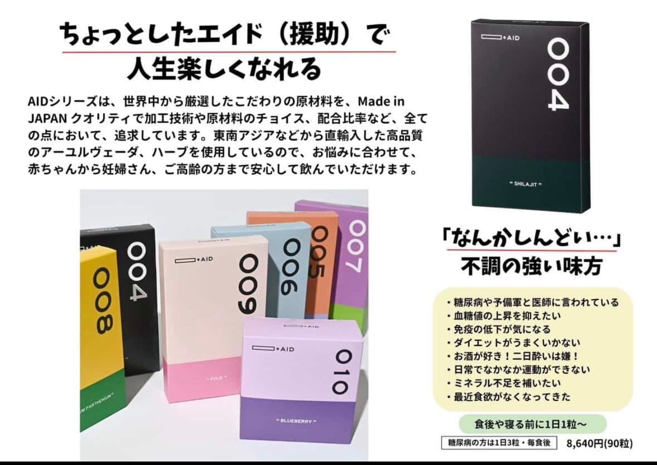AIDシリーズは、世界中から厳選したこだわりの原材料を、Made inJAPAN クオリティで加工技術や原材料のチョイス、配合比幸など、全ての点において、追求しています。東南アジアなどから直輸入した高品質のアーユルヴェーダ、ハーブを使用しているので、お悩みに合わせて、赤ちゃんから妊婦さん、ご高齢の方まで安心して飲んでいただけます。